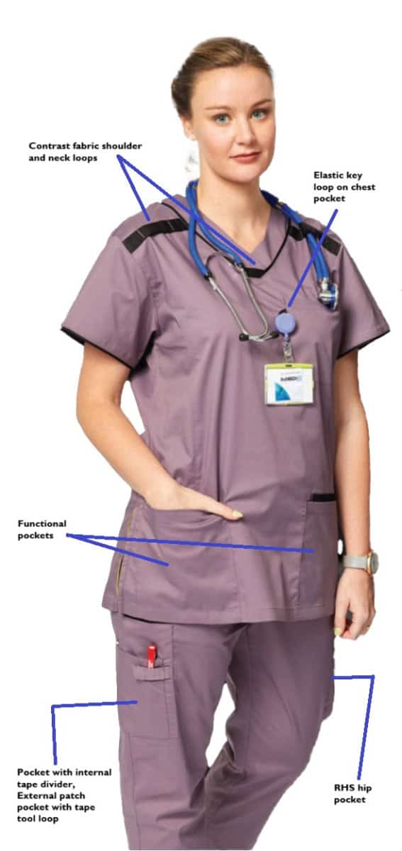 The range of Women’s Stretch Scrub Tops have a V neck with contrast trim. The fabric used is designed to stretch with your every move.